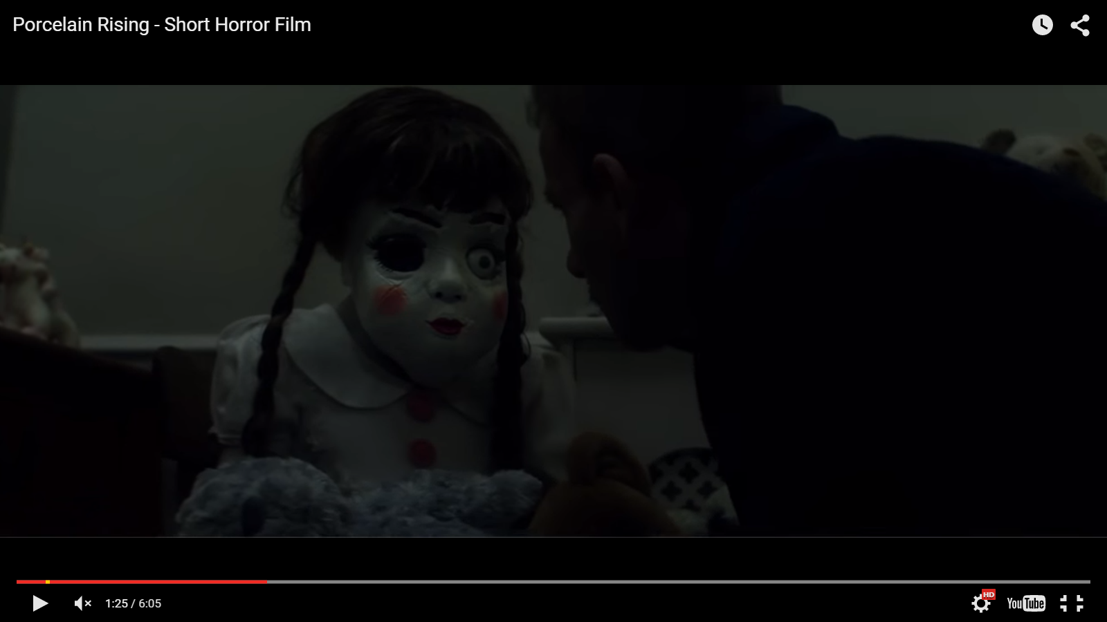 Match on action and close ups have been used a number of times in this short film because it reveals the character's facial expressions and as it switches camera angles at a fast pace, it then shows what the doll has done to the character.